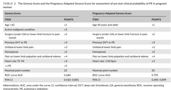Probabilidades pretest: En la población general, éstos están establecidos para determinar la posibilidad de TEP y además de guiar el estudio (Dímero D o imágenes). Estos pretests no están validados en embarazadas, aunque algunos estudios muestran buena correlación. El más usado a nivel internacional en este contexto es el «Pregnancy-Adapted Geneva Score» que incluye lo siguiente: